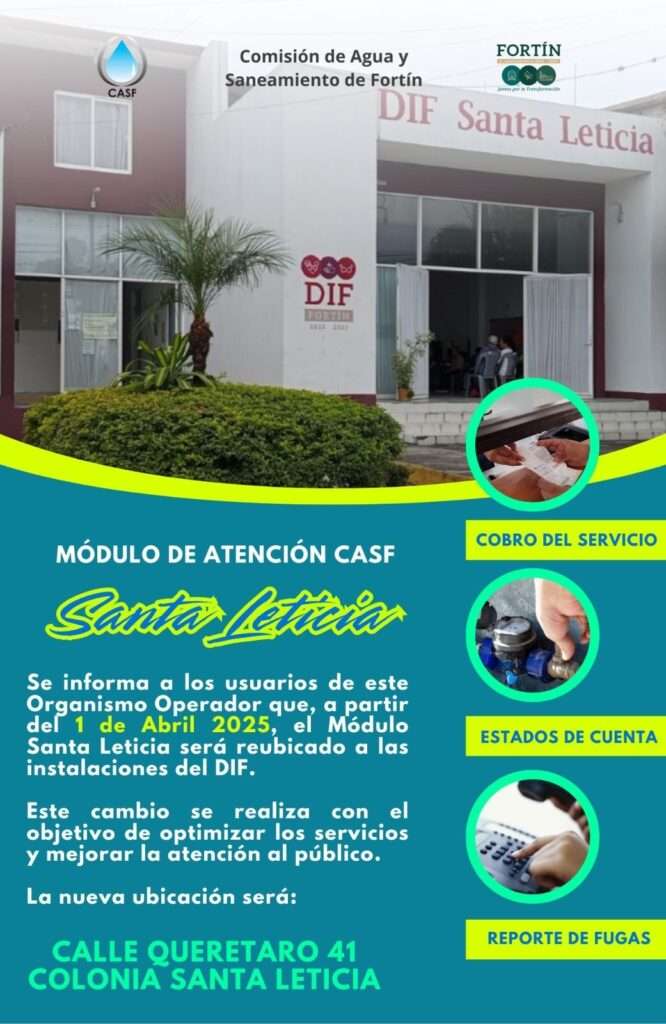 A partir del 1 de Abril 2025 el Módulo CASF Santa Leticia lo atenderá en las instalaciones del DIF SANTA LETICIA, ubicado en Calle Querétaro 41 Colonia Santa Leticia.