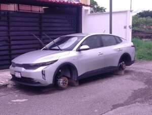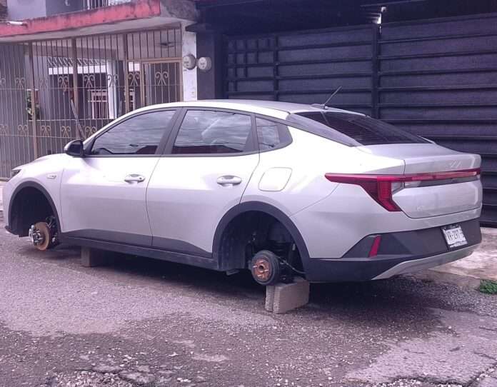 Córdoba, Ver.- Un vehículo KIA de modelo reciente fue dejado sobre unos blogs, debido a que delincuentes le robaron los cuatro neumáticos causándole daños materiales cuando se encontraba estacionado afuera de un domicilio ubicado sobre la avenida Crisantemos y calle 35 del fraccionamiento Jardines del Sur.